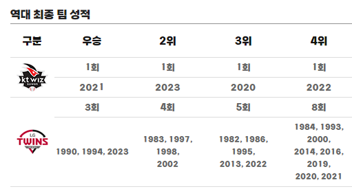 역대 포스트시즌에서 LG와 KT 맞대결에서는 LG가 4승 1패로 우세를 보이고 있습니다. 그리고 다음 시리즈로 진출한 횟수를 비교해보면 KT는 5번 중 3번, LG는 21번 중 11번을 다음 시리즈 진출에 성공했습니다.