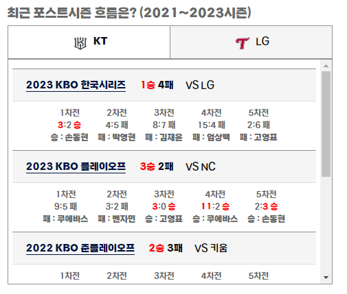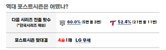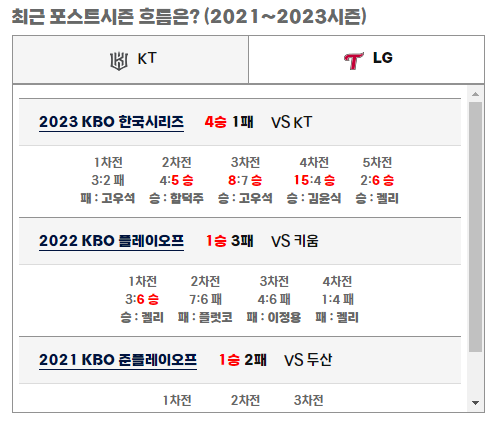 역대 포스트시즌에서 LG와 KT 맞대결에서는 LG가 4승 1패로 우세를 보이고 있습니다. 그리고 다음 시리즈로 진출한 횟수를 비교해보면 KT는 5번 중 3번, LG는 21번 중 11번을 다음 시리즈 진출에 성공했습니다.