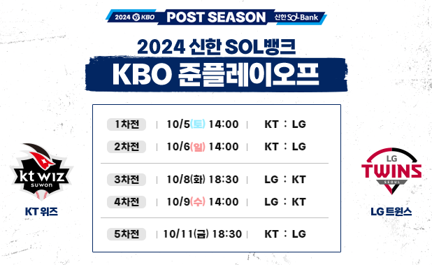 준플레이오프는 10월 5일 시작하여 최대 10월 11일까지 진행됩니다. 경기일정은 다음과 같습니다.